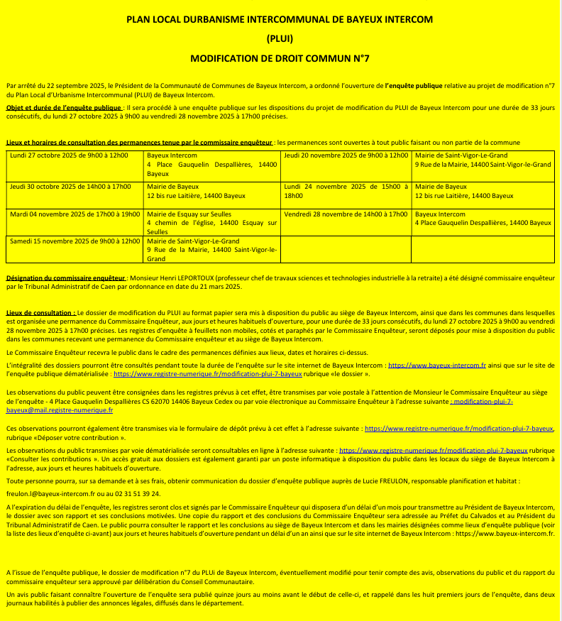 L'enquête publique relative à la modification n°7 du PLUi de Bayeux Intercom se déroulera du lundi 27 octobre 2025 - 9h au vendredi 28 novembre 2025 -17h00.