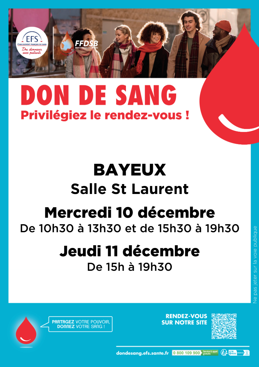 Retrouvez-nous Mercredi 10 Décembre de 10h30 à 13h30 et de 15h30 à 19h30 puis Jeudi 11 Décembre à la Salle Saint Laurent de BAYEUX - Organisez votre venue en vous rendant sur notre site F https://efs.link/whgcE